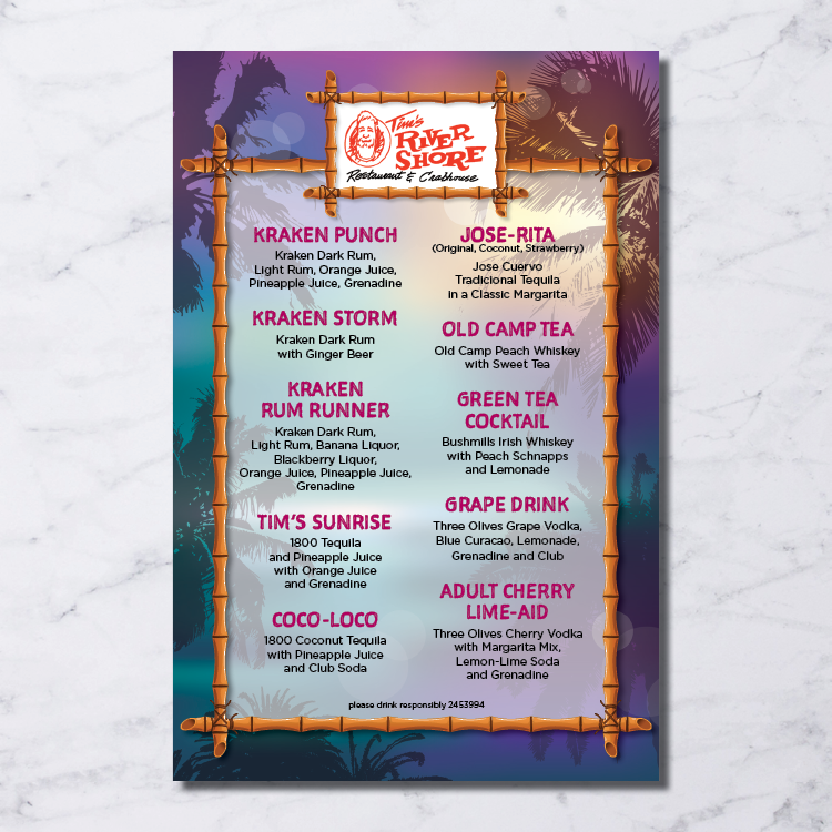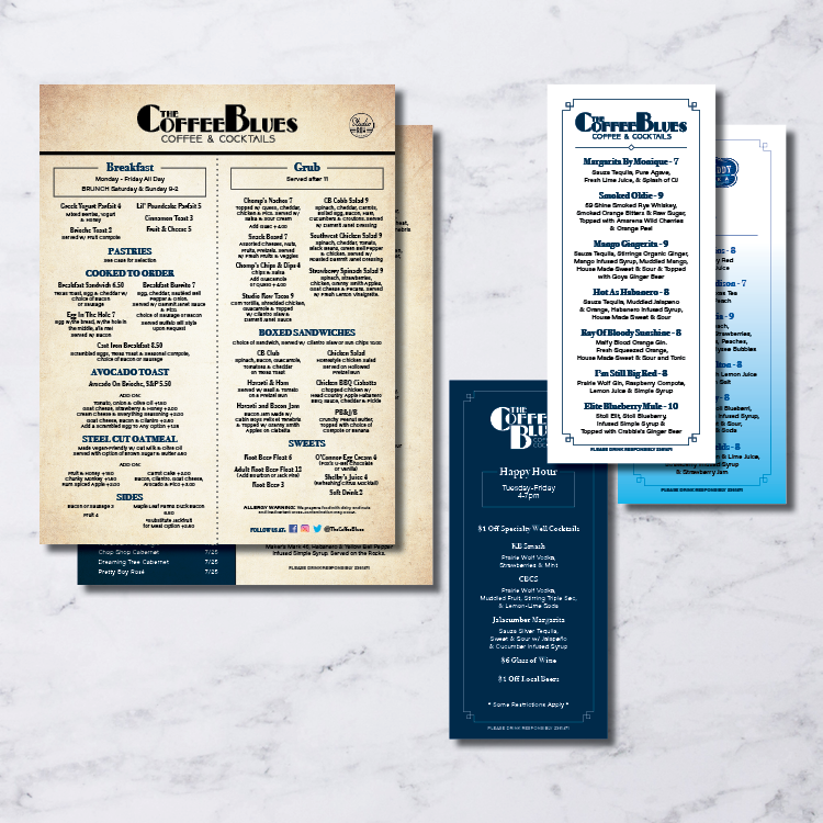 - Projects include traditional print and digital advertisements, menus, and promotional materials.